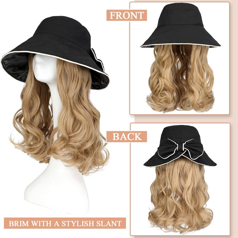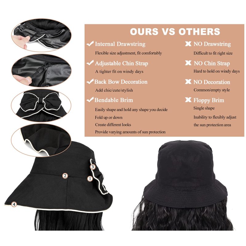 - Strong Sun Protective: This bucket hat wigs have a nice, wide flexible and foldable brim that provide more sun protection than a baseball cap. The brim is just about right and wide enough to shade both face, ears and neck without being so large as to interfere with vision. You can fold the brim up or down or bend according to the shape you want. Wide brim hat has a hidden drawstring around the inner band so that you can adjust the size.