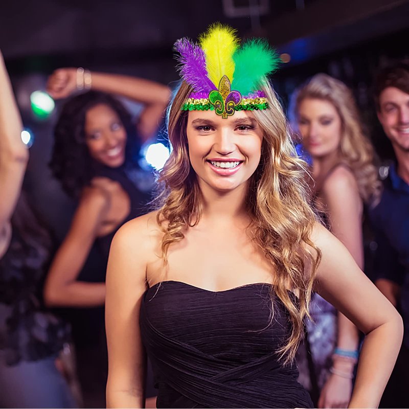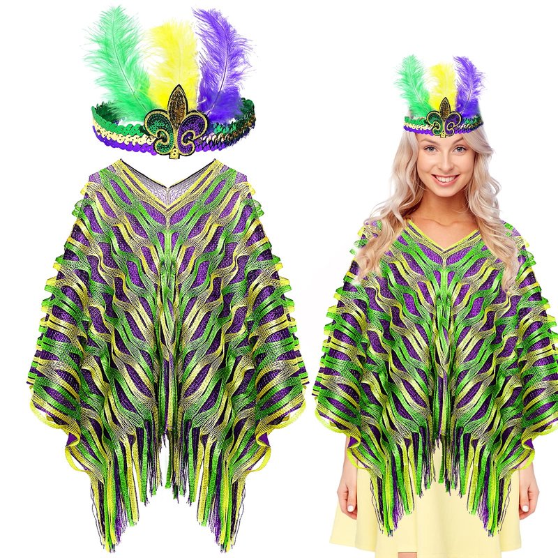 - 【Carnival Decorations】Mardi Gras poncho and feather headband set. They are made of soft fabric and exquisite feathers, which are lightweight and comfortable, skin-friendly and reusable. That will bring you the happiness of Mardi Gras easily.