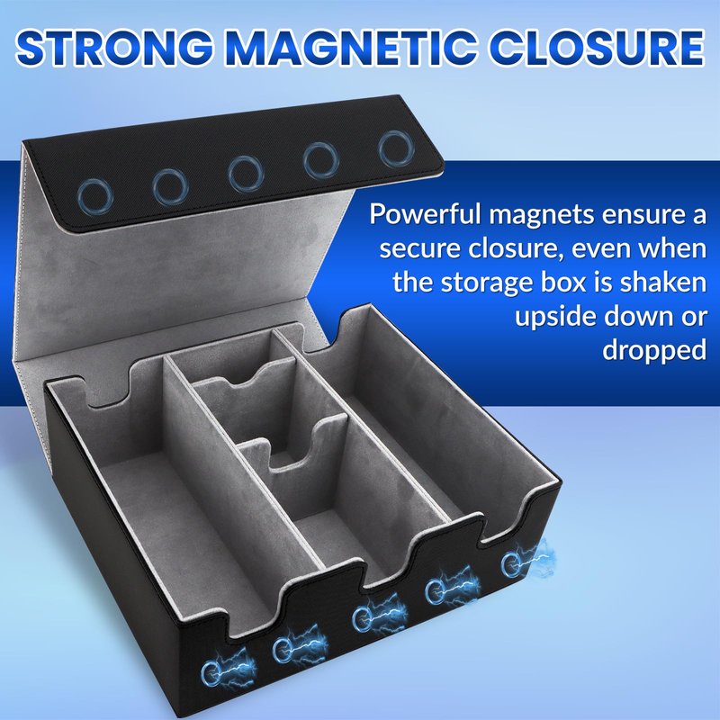 - 𝐄𝐱𝐜𝐞𝐥𝐥𝐞𝐧𝐭 𝐐𝐮𝐚𝐥𝐢𝐭𝐲 𝐌𝐚𝐭𝐞𝐫𝐢𝐚𝐥𝐬: The trading card storage box features a premium waterproof PU leather surface and soft ultra-fine fiber interior lining, ensuring durability and craftsmanship to prolong its lifespan and assist in better card collection. Equipped with large magnetic closures, it easily adapts to various storage environments. With a compact structure, the box ensures good stability, effectively preventing card wear and loss.