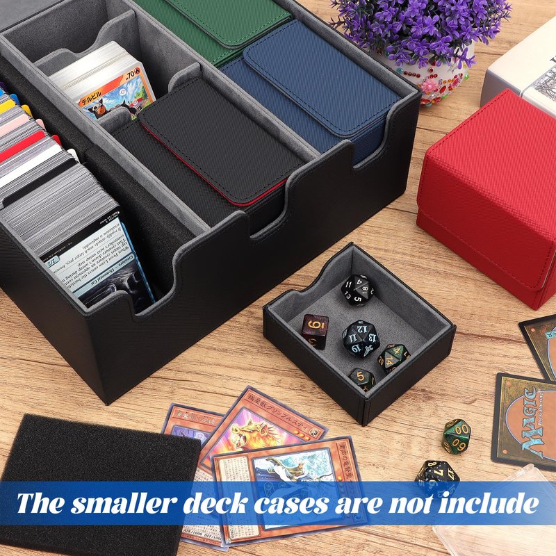 - 𝐒𝐭𝐨𝐫𝐞 𝐘𝐨𝐮𝐫 𝐌𝐓𝐆 𝐃𝐞𝐜𝐤 𝐂𝐚𝐬𝐞: Our TCG card storage box set elegantly showcases cards while ensuring organized storage. You can store 5 card deck boxes smaller than 3.2"L x 3.6"W x 4.2"H or experiment with different storage combinations. The Dice Tray can hold your dice, counters, tokens, badges, and other gaming accessories.