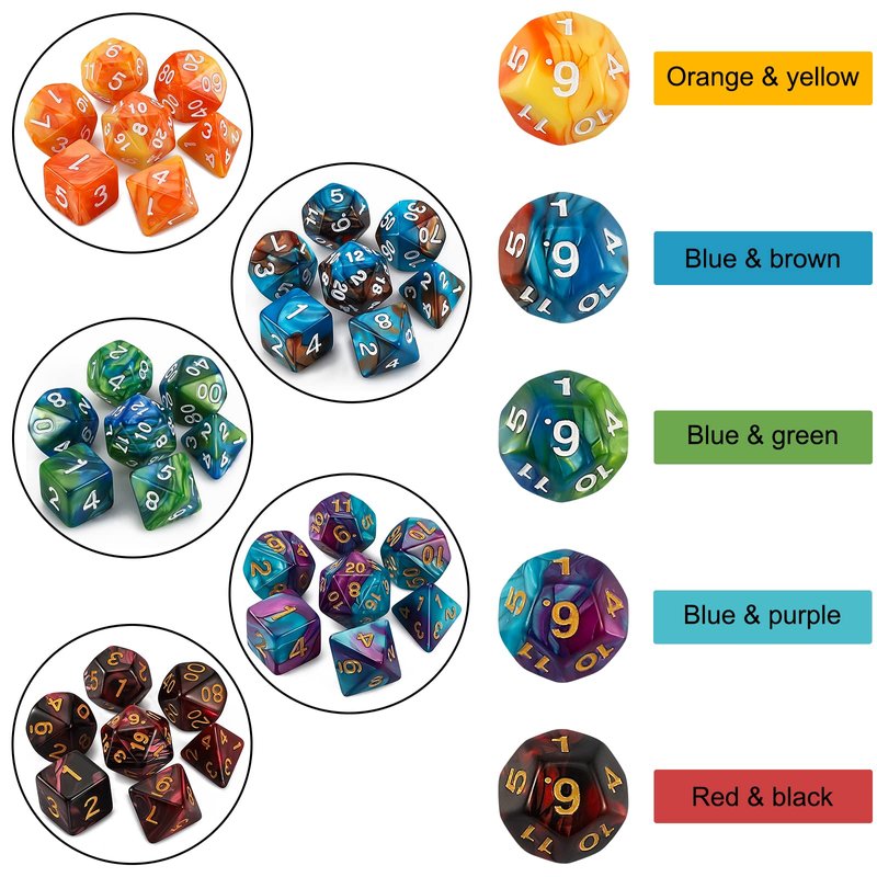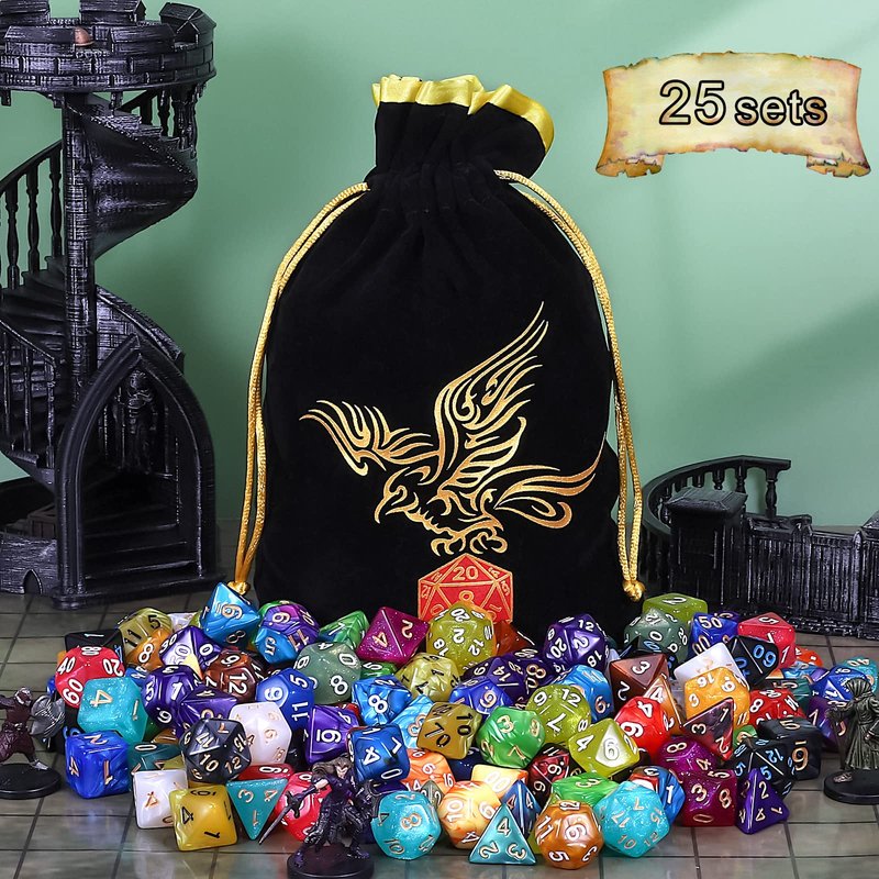 - Super DND dice set : 25 sets of 7dice ( 175pcs in Total ), Including 5 sets of double-color polyhedral dice that have a slight pearled sheen. Comes with a black Drawstring bag, convenient to store and carry.