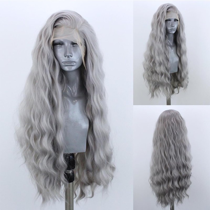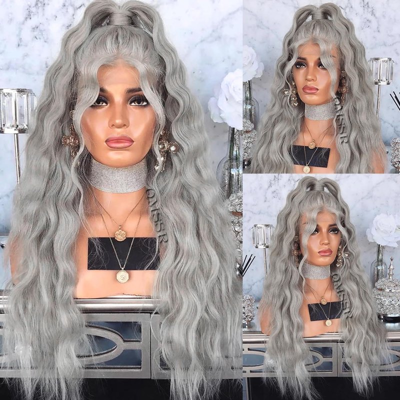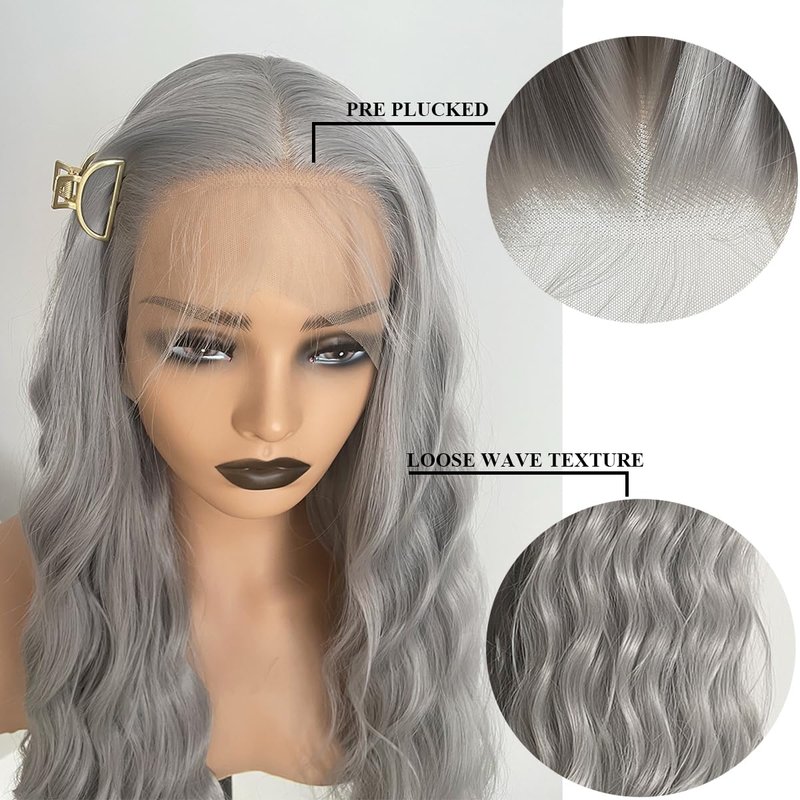 - Grey synthetic lace front wig, hand-tied 13x3 lace front, 24 inch long loose wave texture, pre plucked hairline, healthy hair luster
