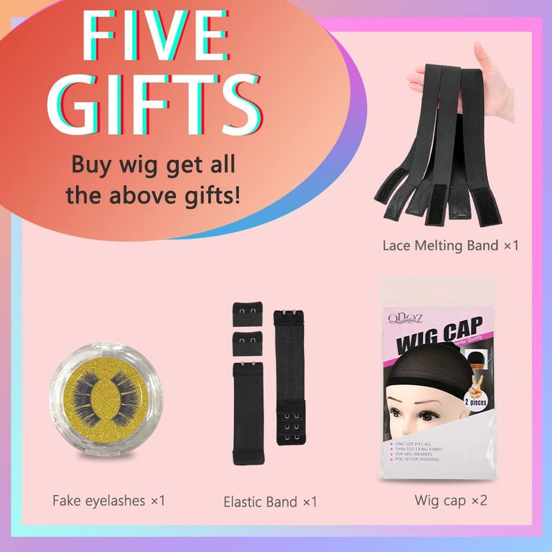 - 🌹【Five Accessory】1.Silk Bag: soft texture, can protect the wig well from wear and tear, fashionable appearance, can be used as for family and friends; 2.Wig Cap: convenient to wear a wig; 3.Elastic Band: help making your wig stay in place and change the tightness to fit your head circumference;4.Lace Melting Band: used to melt your lace and keeping baby hair in place so your wigs can look as natural;5.Eyelashes: rich styles, you can apply to many occasion.