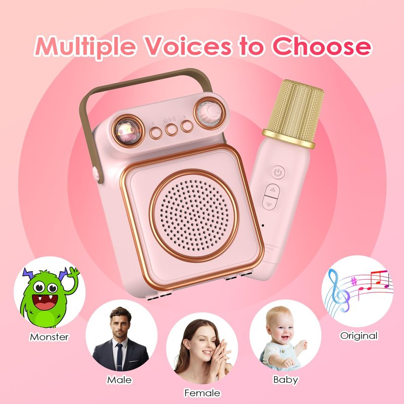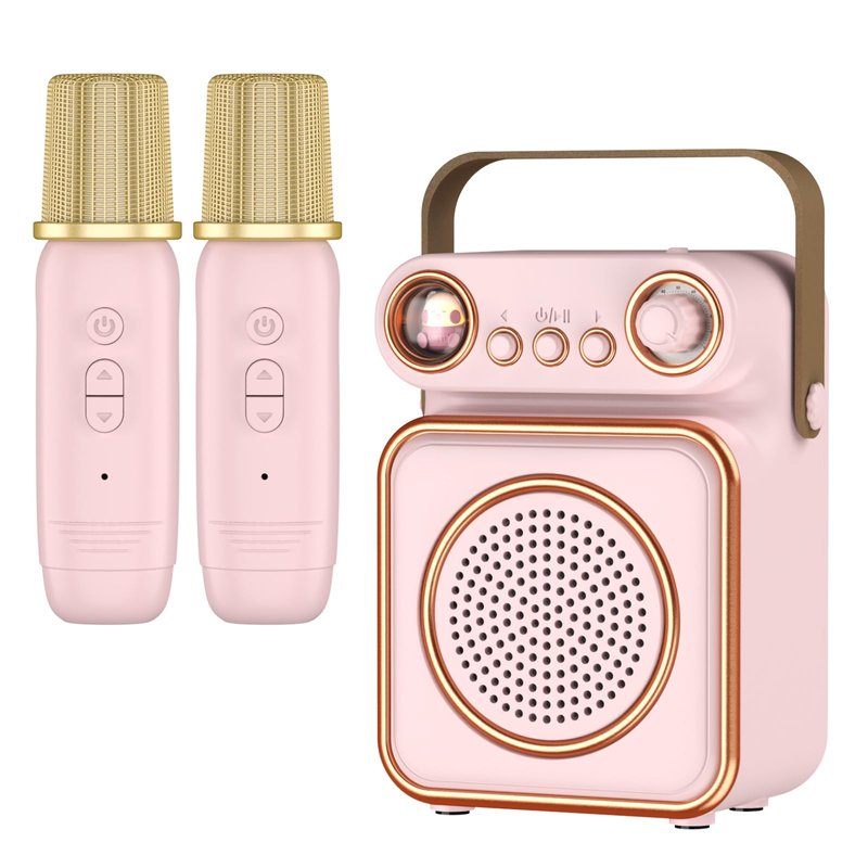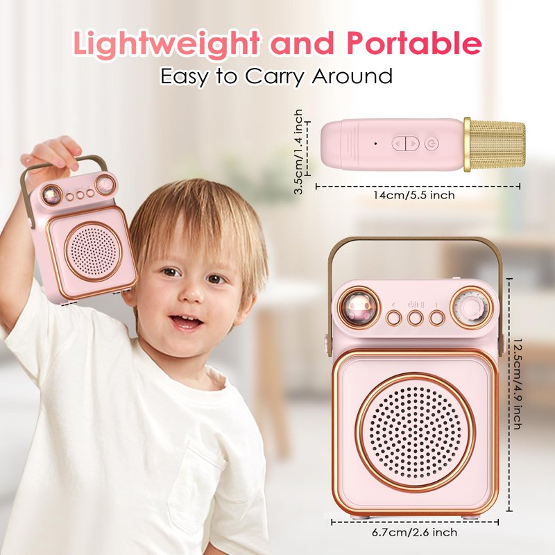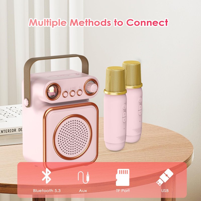 Qoosea Mini Karaoke Machine with 2 Wireless Microphones Portable Bluetooth Microphone with Speaker for Kids and Adults 5W Output Speaker with Light Birthday Gifts for Girls Ages 4~12+ Years Old (Pink)