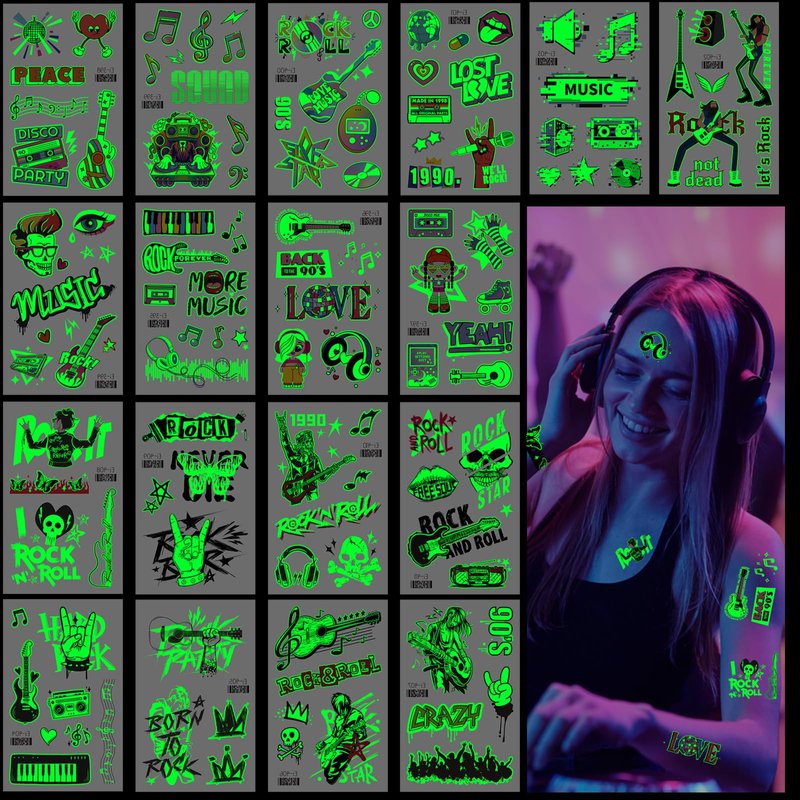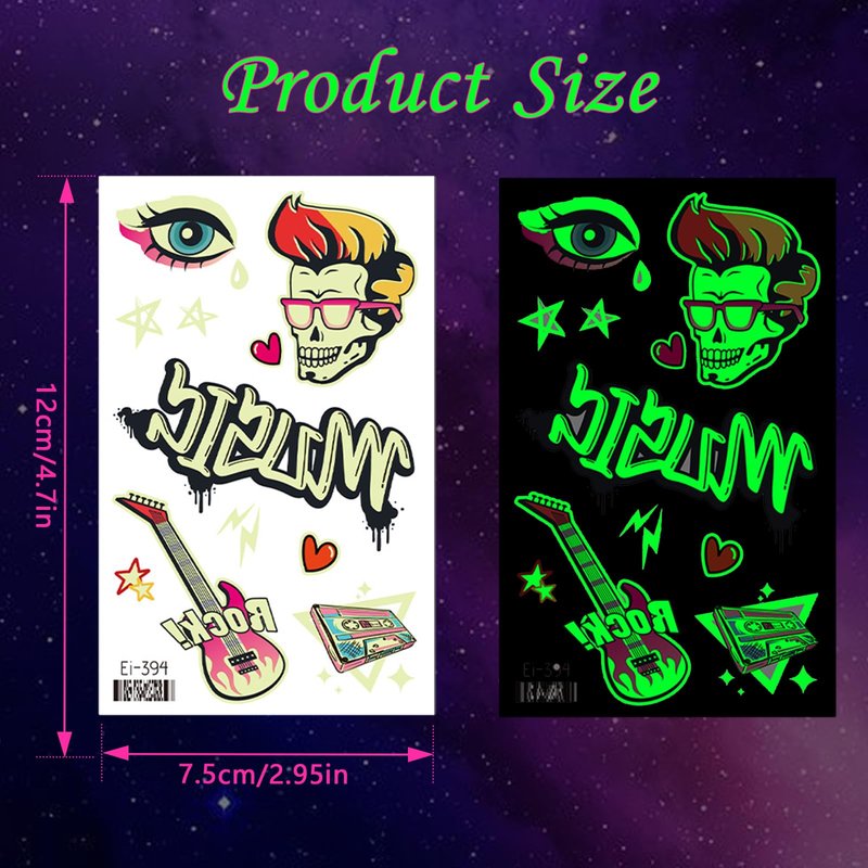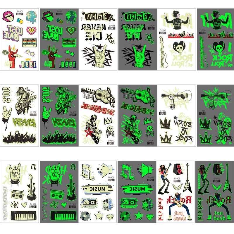 - 🎵【Luminous Temporary Tattoo】Package contains 18 sheets of more than 110 styles, various shapes and sizes of electric guitars, musical notes, skulls and other patterns for you to choose from, a wealth of styles enough to meet the needs of your use and sharing needs, so that you can become the focus of a variety of activities!