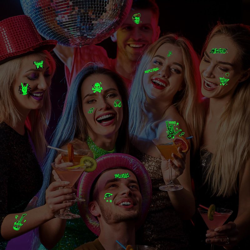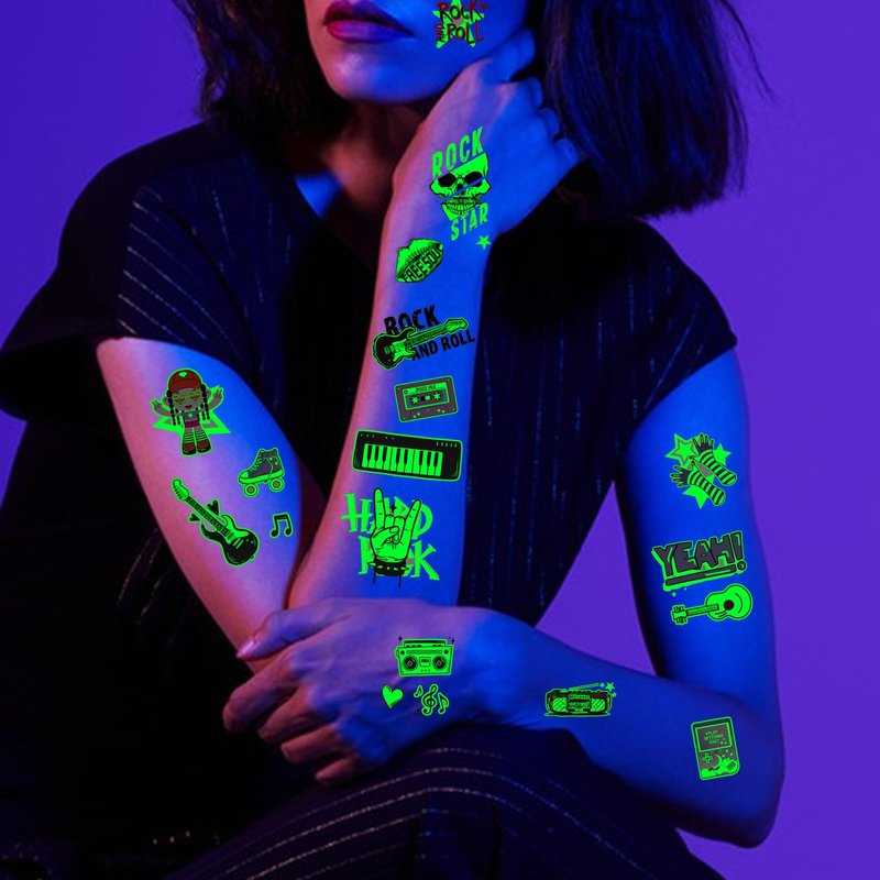 - 🎵【Tips for Glowing Tattoos】To make sure that tattoo has enough energy to shine in the dark, place these vivid facial tattoos under a bright light source beforehand to activate them, such as sunlight or ultraviolet rays. The longer it sits under a bright light source, the brighter the light will be in the dark!