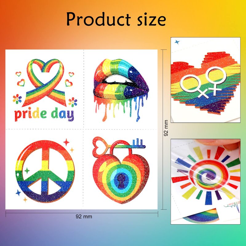 - 🌈 【Great for Gay Pride celebrations】These shiny rainbow tattoos are suitable for gay pride celebrations pride festival and rainbow party favor bag fillers.People will love this novel way to express their love for life. The vivid love rainbow stickers will make you shine in the crowd.