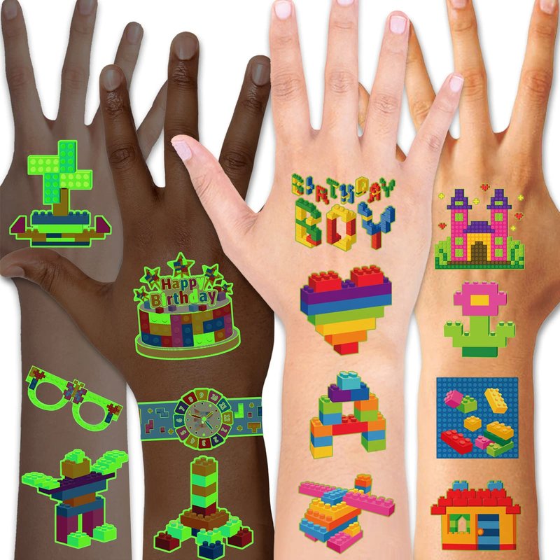 - 8 Glow Bricks in the Dark Kids Temporary Tattoo Perfect for any brick birthday party, it's the most popular gift for kids!