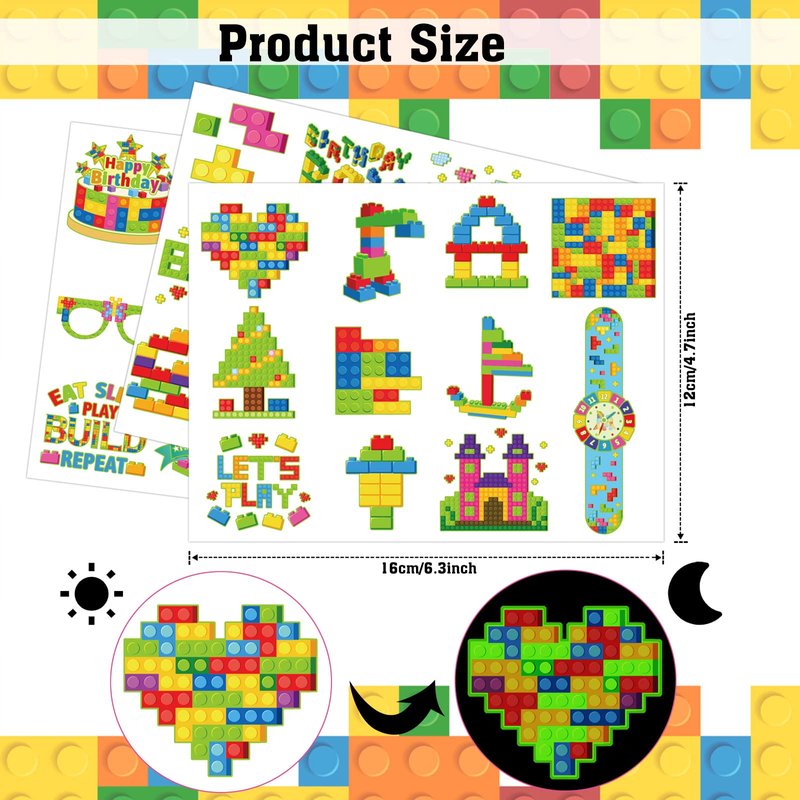 - 【Building Party Decorations】These glow-in-the-dark tattoo stickers for children's birthday parties are perfect for building block parties and are perfect for use as brick party gifts, block game rewards, brick-themed birthday party decorations, and many more prizes. The size of each sheet is 12*16cm/4.7*6.2inch.