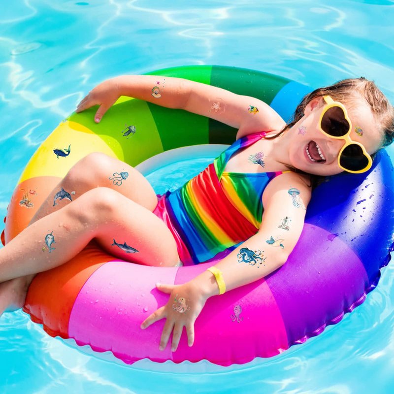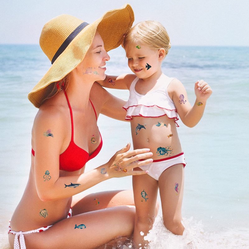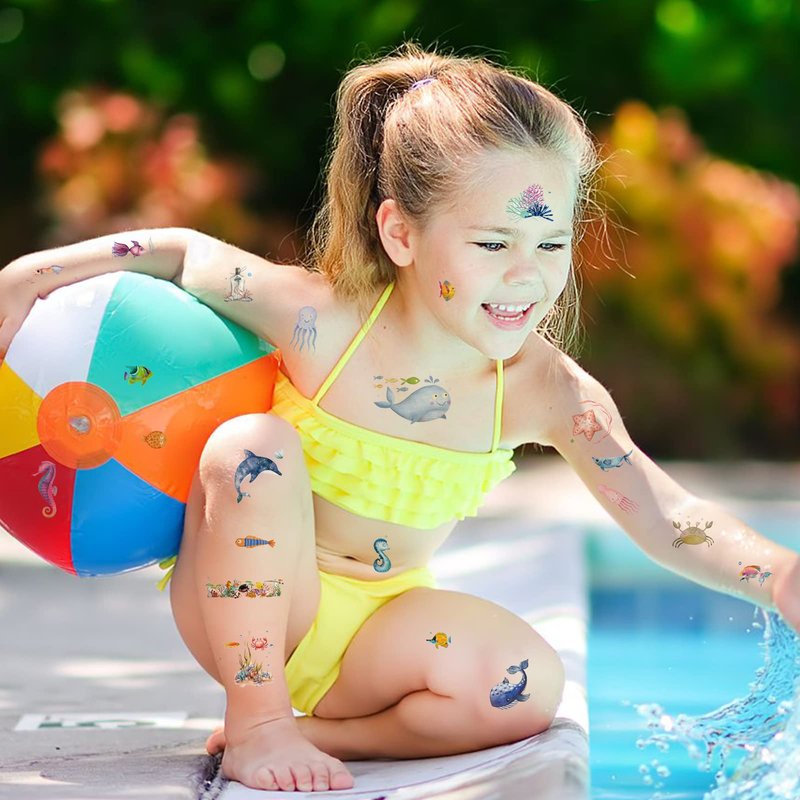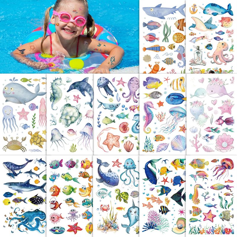 - 【Marine World Fake Tattoo Stickers】Ocean temporary tattoos contains different marine animals, such as dolphin, shark, octopus, seahorse, fish, starfish, turtle, coral, shell, crab, etc. It is loved by children. Let the kids experience the joy of tattooing!
