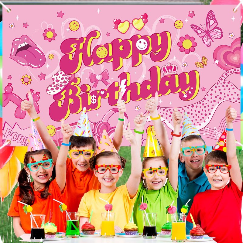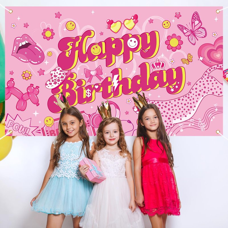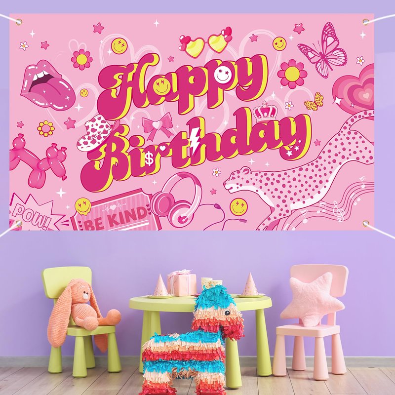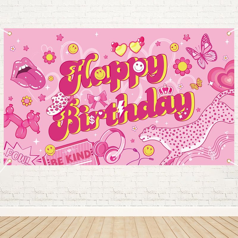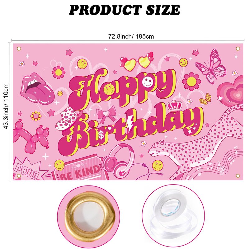 - 【Happy Birthday Pink Background Cloth】You will receive a preppy birthday banner with a white ribbon, hot pink theme color with pink leopard, balloon, butterfly, heart, headphones and other unique design patterns and "Happy Birthday" letters.