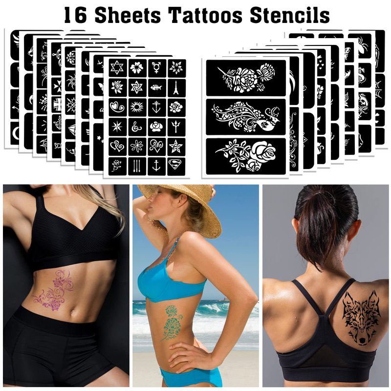 - ▶ Henna Tattoo Kit: 16 sheets tattoo stencils. airbrush tattoo stencils suitable for tattoo lovers. Experience the effects of tattooing without the pain of tattooing.