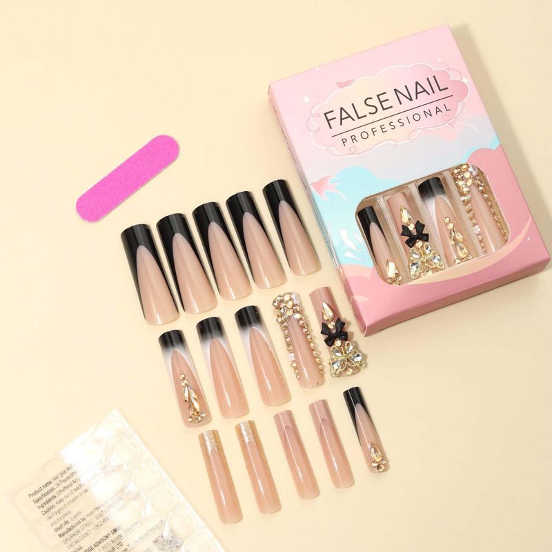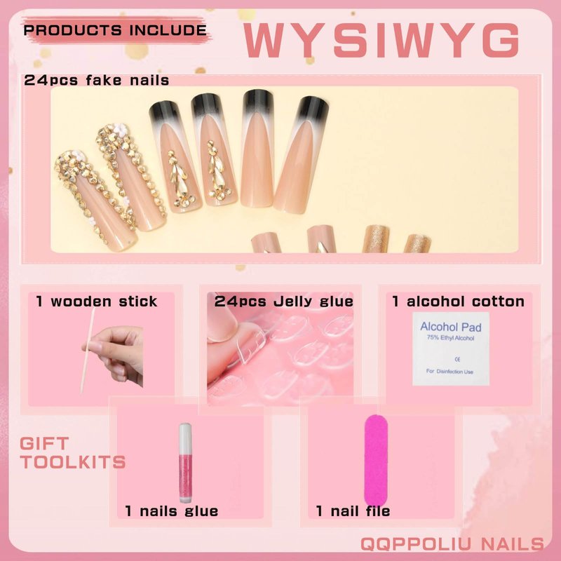 False nails contains 24 pcs acrylic nails, allowing you to choose the fake nail pieces that fit your nail size. Application: 1.Wash hand and push back cuticles. 2.File and shape your nails. 3.Choose your nail size. 4.Apply a layer of glue or adhesive tape on your nail and hold down firmly for 30-50 seconds. Unloading method: Adhesive tape of adhesive type:soak your nails in warm water for about 5 minutes and peel off along the edges. Glue of adhesive type:Soak nails in warm water for 12-20 minutes.At the cuticle line.carefully lift up the edge using the cuticle stick.Apply your favourite cuticle oil under the nail for fastest removal. Considerations:Avoid sticking inflammation wounds.Use the small wooden sticks carefully, and do not put it in reach of children.