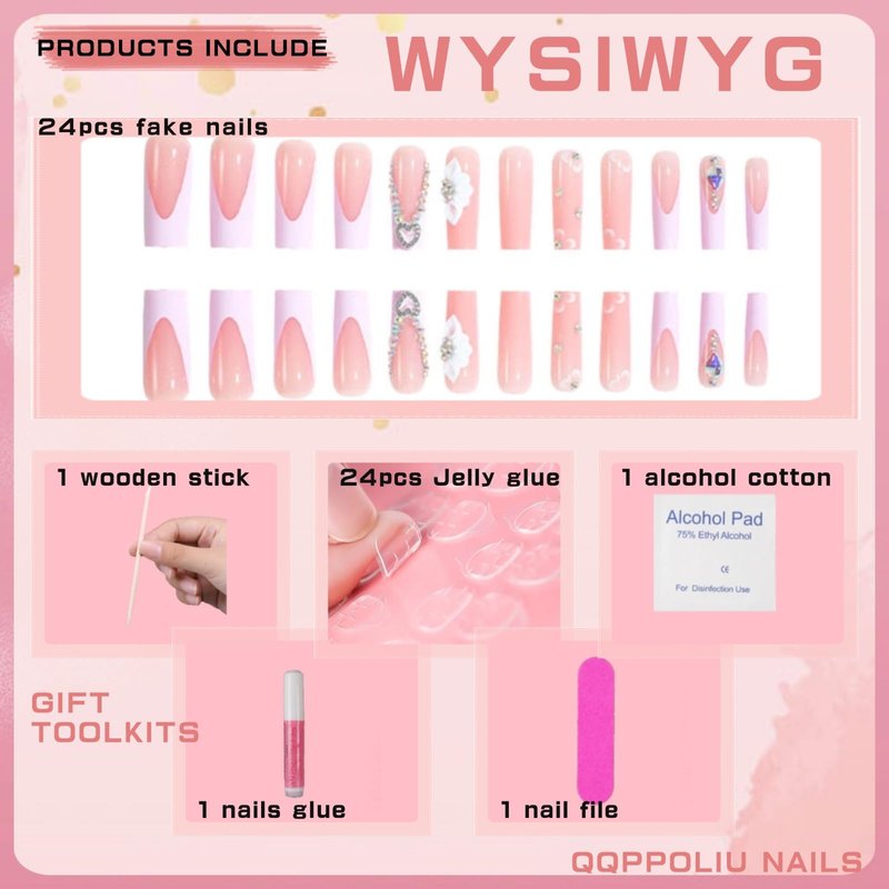 False nails contains 24 pcs acrylic nails, allowing you to choose the fake nail pieces that fit your nail size. Application: 1.Wash hand and push back cuticles. 2.File and shape your nails. 3.Choose your nail size. 4.Apply a layer of glue or adhesive tape on your nail and hold down firmly for 30-50 seconds. Unloading method: Adhesive tape of adhesive type:soak your nails in warm water for about 5 minutes and peel off along the edges. Glue of adhesive type:Soak nails in warm water for 12-20 minutes.At the cuticle line.carefully lift up the edge using the cuticle stick.Apply your favourite cuticle oil under the nail for fastest removal. Considerations:Avoid sticking inflammation wounds.Use the small wooden sticks carefully, and do not put it in reach of children.