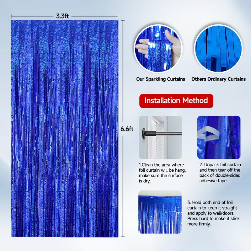 - Easy Installation: Each Metallic Tinsel Party Streamers is equipped with self-adhesive tape on the back. Simply peel off the tape and stick the foil curtain onto any clean, flat surface such as a wall, door, window, or table. This effortless setup allows you to quickly decorate your parties.