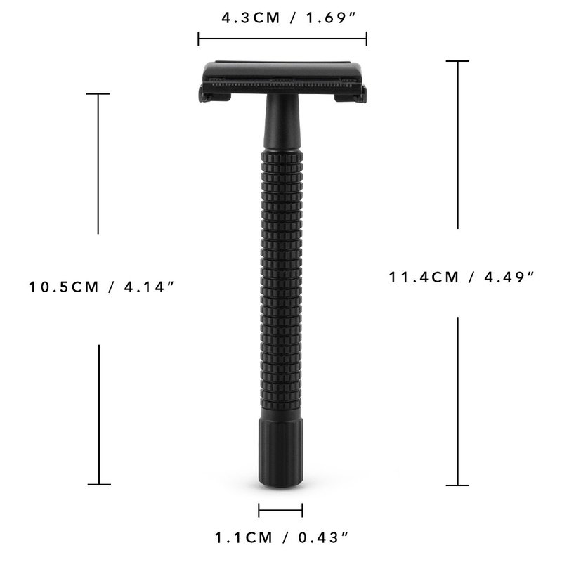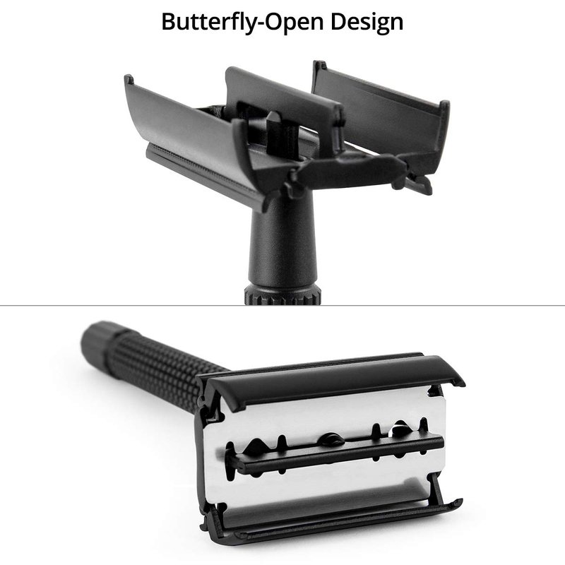 This is a classic double edge safety razor. It has a twist to open (butterfly open) design that allows quick and easy blade changes. 4 inch long handle, made from premium brass and beautiful black matte chrome plated, has a knurled pattern for good grip, even with wet hands. It prevents against rust in wet enviroment. Package includes: - 1 pc Double Edge Razor - 1 pc leather razor protector case - 1 pc cleaning brush - 5 pcs Titanium double edge blades