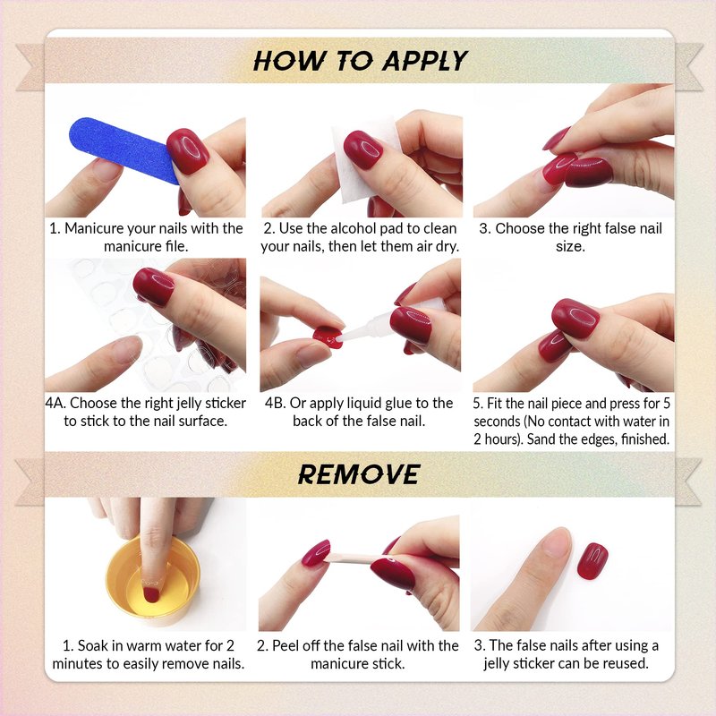 - Avoid touching water within 2 hours after the fake nails are put on.