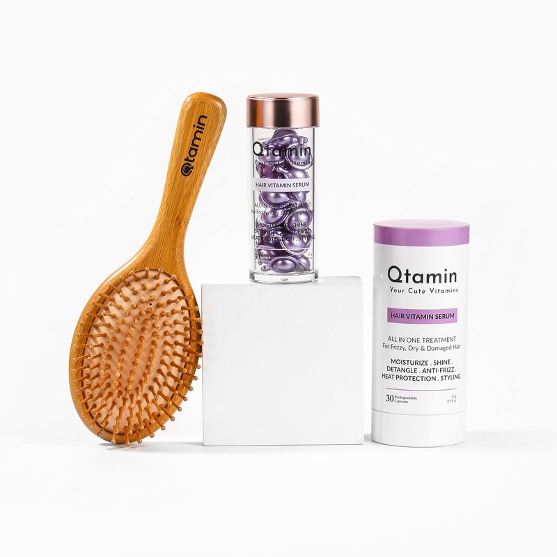 Qtamin All-in-One Hair Serum Capsule+ Bamboo Brush for Repair, Nourish & Tame! Keratin Treatment, Scalp Oil, Anti-Frizz, Heat Protectant, Growth Booster For Curly, Dry, Damaged & Frizzy Hair