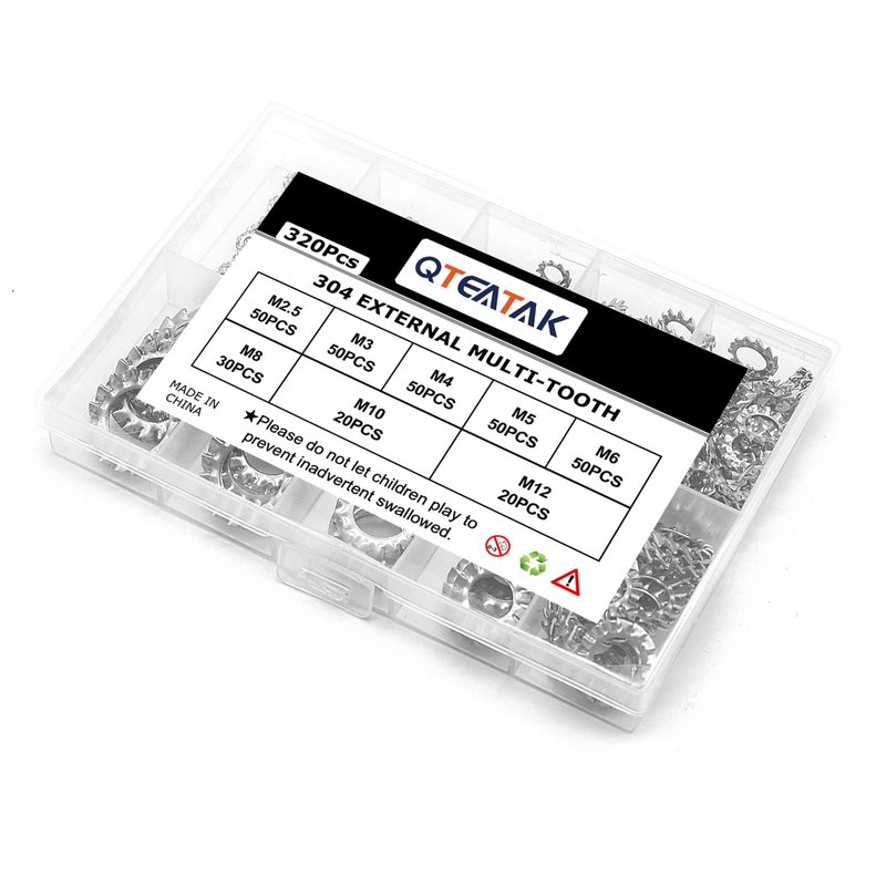 - External Tooth Star Lock Washers: High Quality Stainless Steel External Tooth Star Lock Washers Set of 320 pcs, includes the most commonly used 8 sizes: M2.5: 50 pcs / M3: 50 pcs / M4: 50 pcs / M5: 50 pcs / M6: 50 pcs / M8: 30 pcs / M10: 20 pcs / M12: 20 pcs.