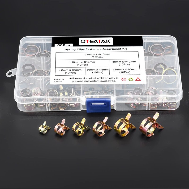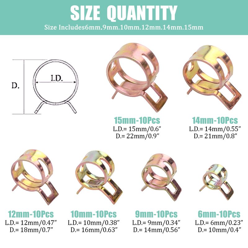High Quality Spring Clips for hose air hose, water pipe, automotive fuel line, silicone hose, etc. Material: 65Mn Spring Steel Packing quantity: 72pcs Package included: 10 x 6mm-----------------------------10pcs 10 x 9mm----------------------------10pcs 10 x 10mm----------------------------10pcs 10 x 12mm----------------------------10pcs 10 x 14mm----------------------------10pcs 10 x 15mm----------------------------10pcs