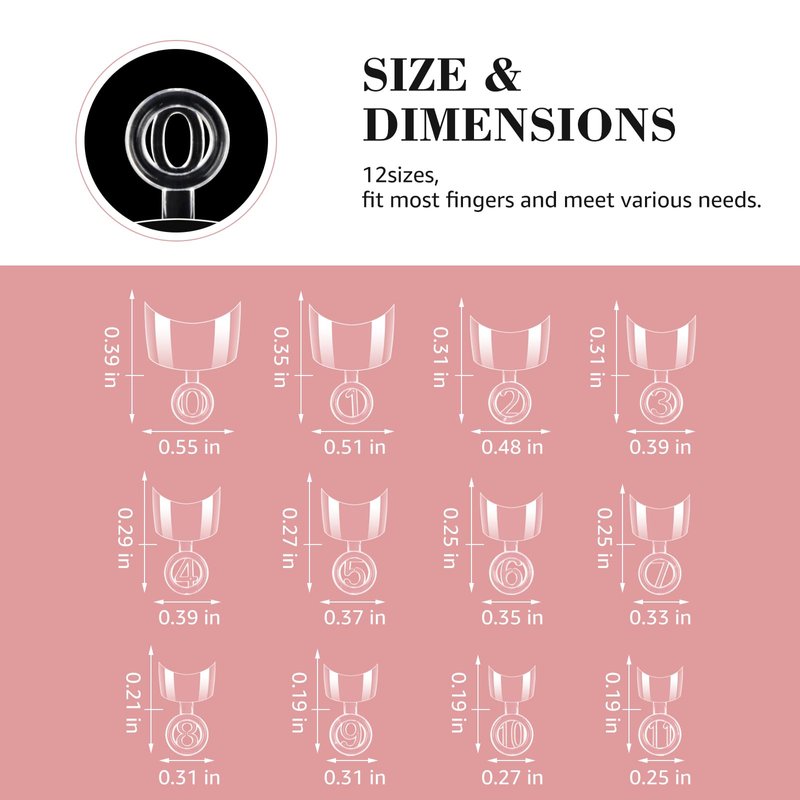 Our extra short nail tips are available option in various sizes, total 12 different sizes, 600pcs without glue half cover square nail tips, each nail tips with number notes.