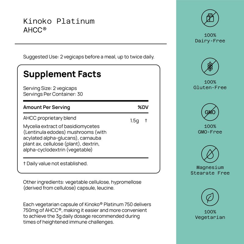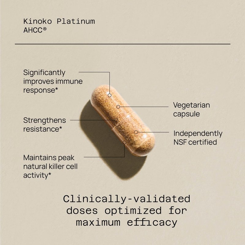 - SUPPORTS IMMUNE HEALTH, LONGEVITY & NK CELL ACTIVITY: Kinoko Platinum AHCC capsules have shown to support immune health, enhance cytokine production, promote macrophage activity, T-cell and NK cell activity and longevity.