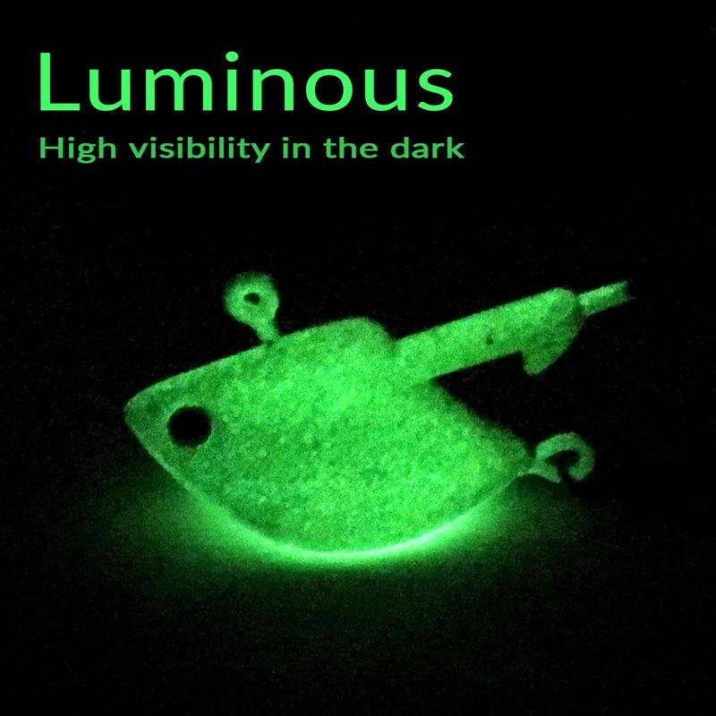- 3.GLOW FISH JIG HEADS:The jig head will glow in the dark,Jig Heads Hook is suitable for various soft lures, earthworm,lobster etc.,and the steel wire is fit the lures,prevent the lures off form hook ,is very convenient and practical.