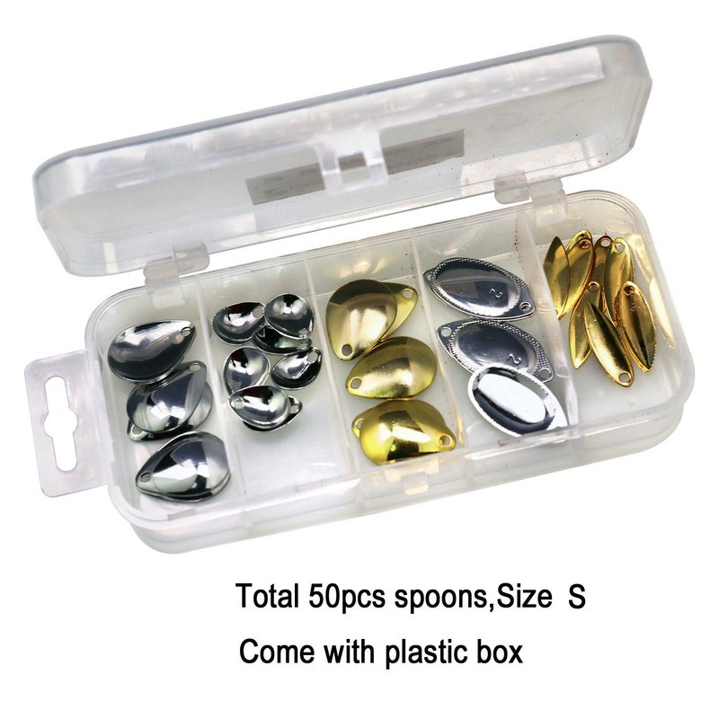 - 5. DECENT QUALITY AND COMPACT KIT: Made with copper and Stainless steel premium material, not easy to rust, spin flawlessly, durable enough for your use. Excellent component to attach a spinning blade on a fishing rig. Good selection/sizes: 1/16 oz x 0.9in x 0.71in x10pcs, 1/50 oz x 0.59in x 0.43in x10pcs, 1/25 oz x 0.9in x 0.71in x 10pcs, 1/20 oz x 1.1in x 0.63in x 10pcs, 1/50 oz x 0.9in x 0.31in x 10pcs, total 50pcs blade spoons S#, came in a box, easy to keep organized.
