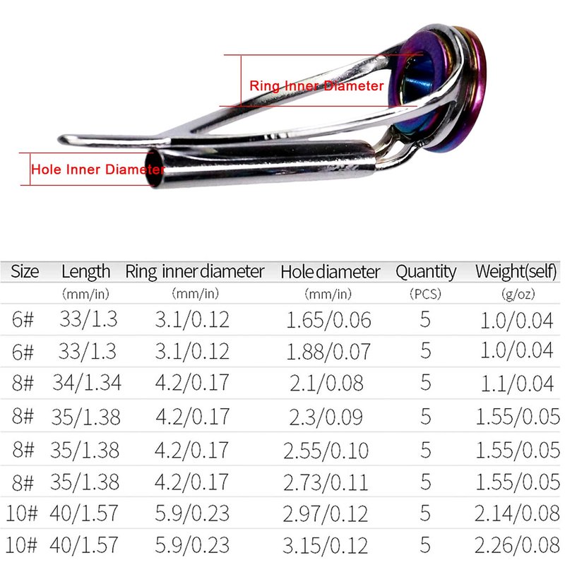 - 5. A WIDE SELECTION OF SIZES: Determining the type and size of guides for your rod building project at first, on tip guides the Tube Bore ‘TB’ is the internal diameter of the tube, we offer 8 sizes rod tip tops: 1.65mm,1.88mm,2.1mm,2.3mm,2.55mm,2.73mm,2.97mm,3.15mm.