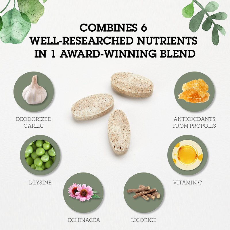 - HERBAL IMMUNE SUPPORT - This complex balance of L-lysine, Vitamin C, Echinacea, Licorice, Propolis, and odorless Garlic help regulate arginine activity and immune systems in your body to maintain wellness.