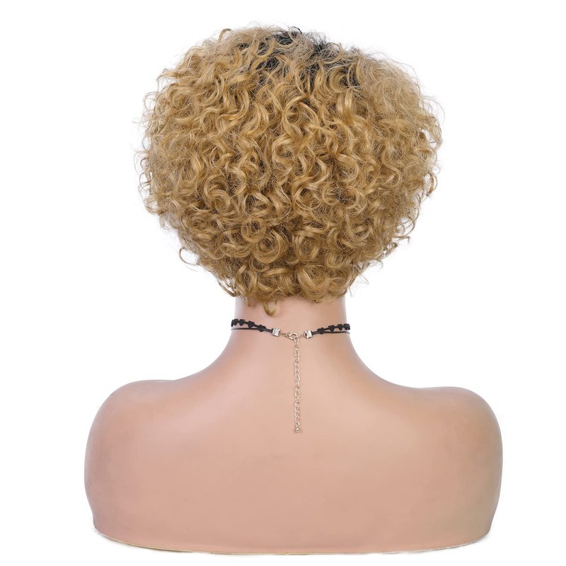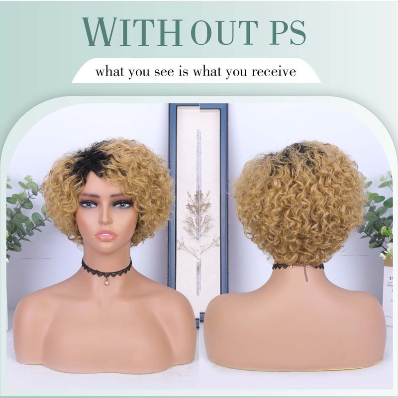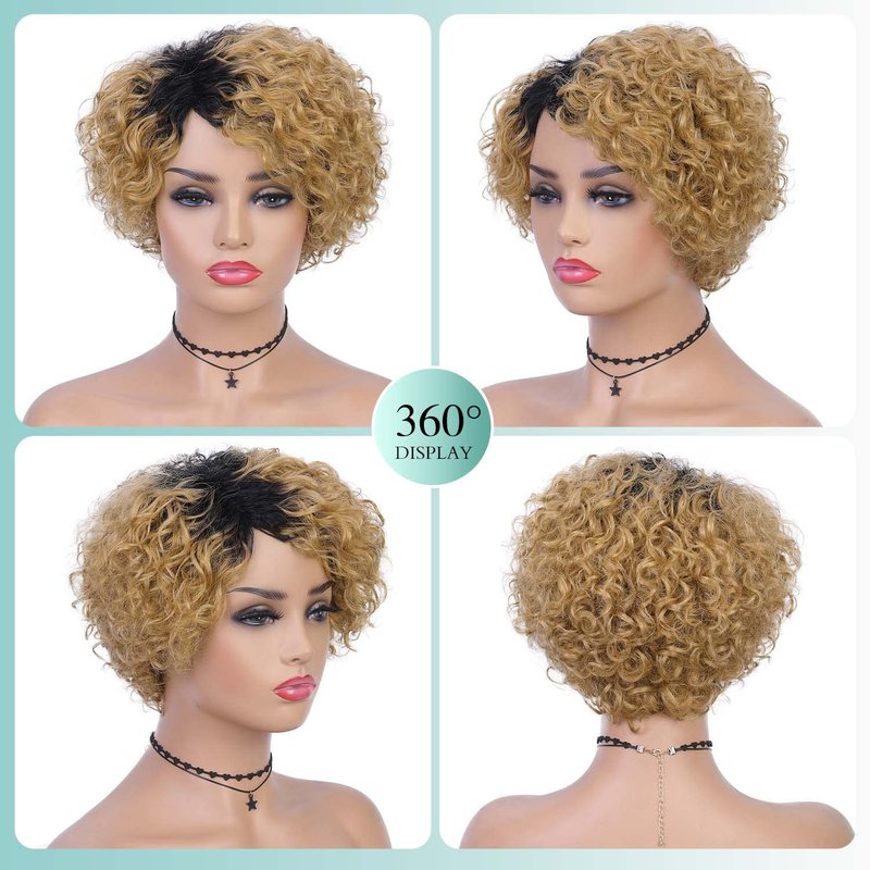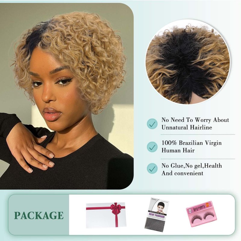 Quantum Love Human Hair Wigs for Black Women Short Curly Human Hair Side Part Wig Pixie Cut Brazilian Remy Human Hair Deep Curly None Lace Front Ombre Blonde Wigs