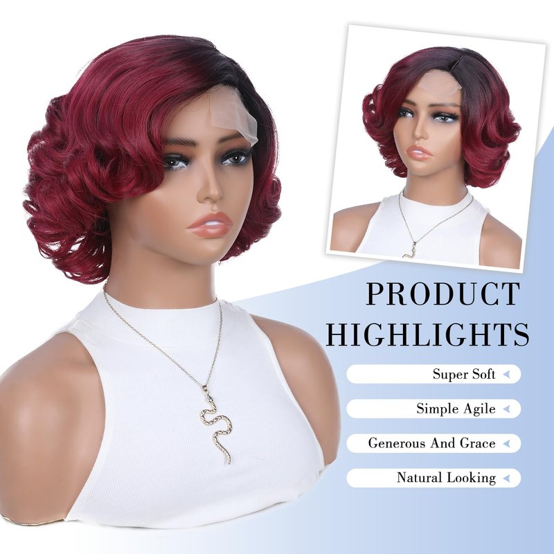 Quantum Love Short Curly Bob Ombre Red Wigs Loose Wave Side Part Wig for Black Women Short Body Wave Bob Synthetic Wig (10 inches)