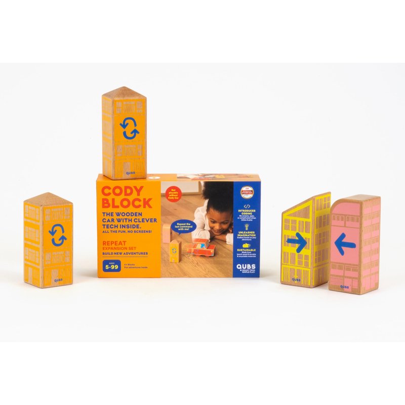 Build new adventures for CODY! Build new adventures for Cody with the Repeat blocks! Use the orange Repeat blocks to make Cody do his last action again, or even set up two in a row to send him on a longer journey! Expansion set includes 2 Repeat blocks, 1 Left turn block, 1 Right turn block and 1 Adveture Leaflet. Not playable alone - needs the CODY BLOCK car. CODY BLOCK sold separately. The Repeat Expansion Set is part of CODY's world. Take a journey into coding with the smart wooden car. CODY BLOCK is on an adventure and needs your help. Can you get him home? Use blocks to change his direction to navigate the city. He drives like magic to introduce coding. Take back playtime with endless fun & hands-on play.