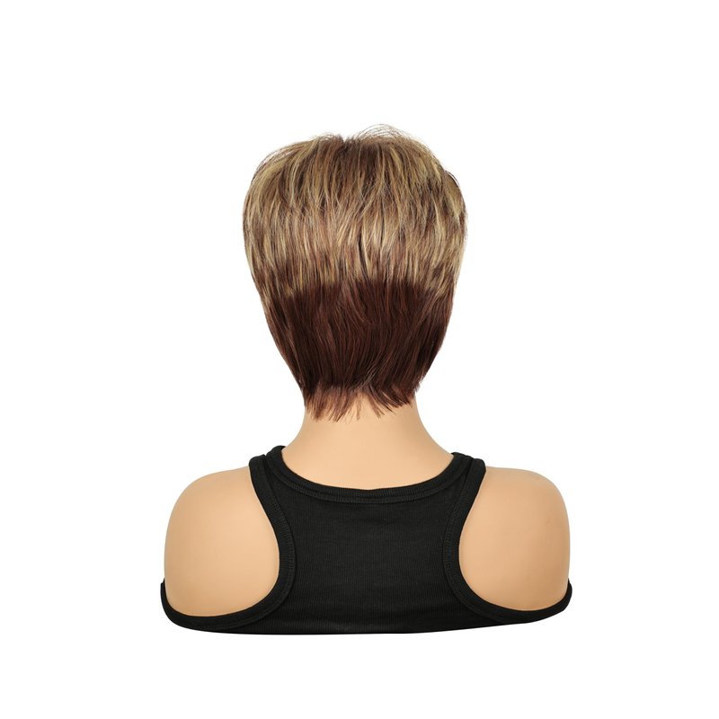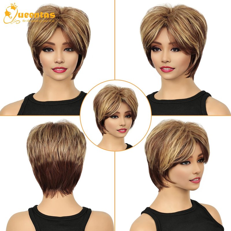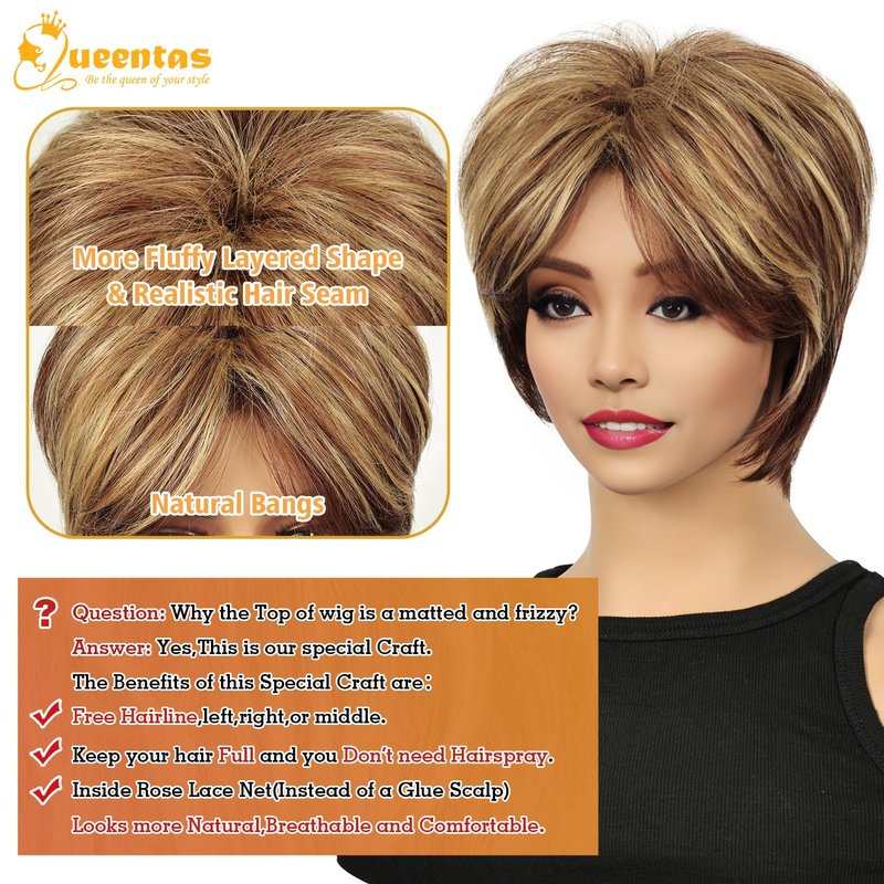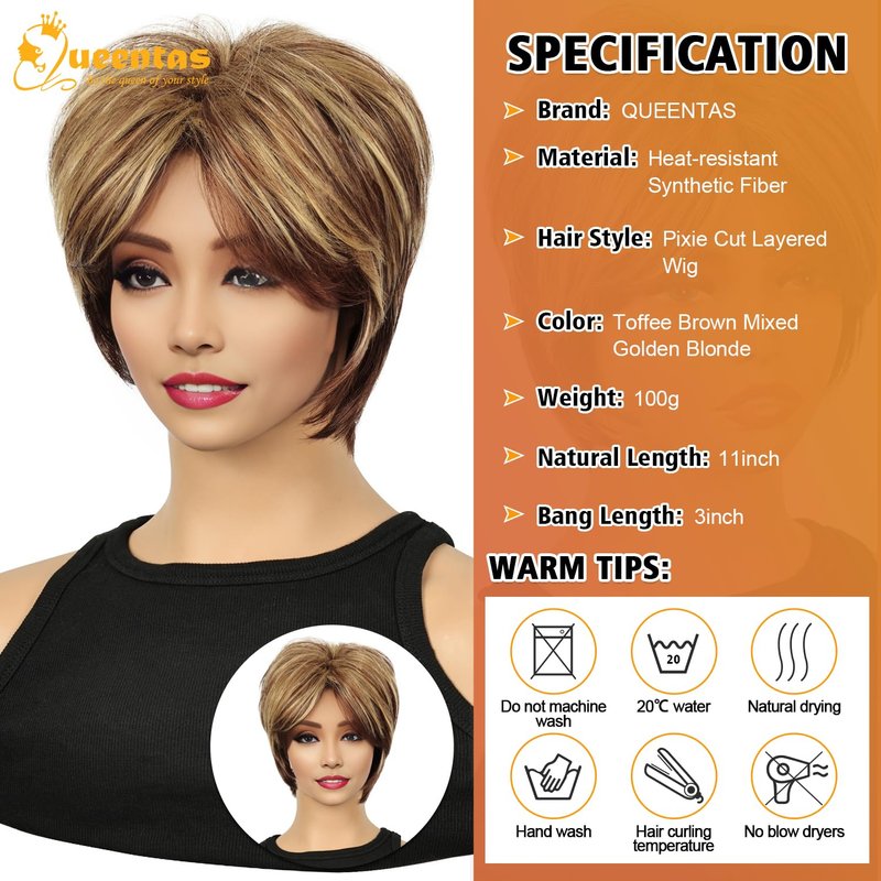 Brand: QueentasHairstyle: short hair wigs for women, pixie cut wig, black short wigColor: Toffee Brown Mixed Golden BlondeEasy to shape, It can be perfectly natural without hairspray