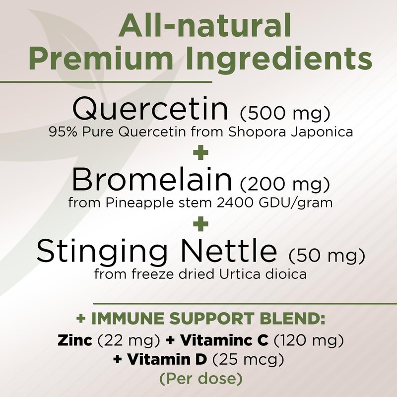 - ✔️ THE KEY BENEFITS:Quercetin with bromelain + Stinging Nettle supports healthy aging, cardiovascular health, helps to reduce the damage and irritation caused by free radicals, helps promote a normal respiratory function, helps to fuel the immune system, helps enhance the absorption of zinc. Quercetin + Nettle, two plant extracts that have been shown to support the immune system upon exposure to environmental challenges.*