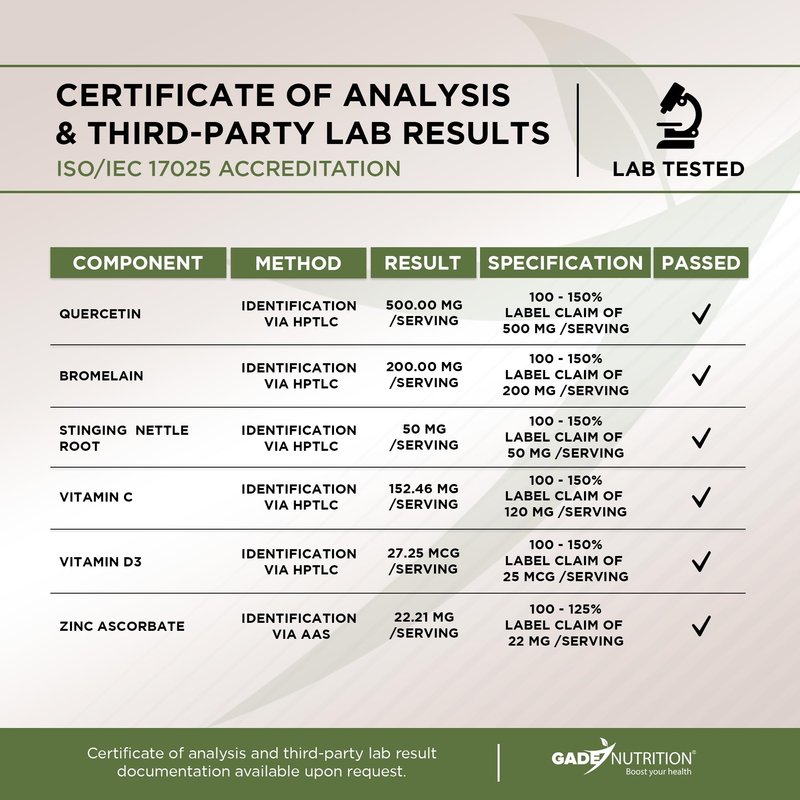 - ✔️A POTENT COMBINATION TO BOOST THE IMMUNE SYSTEM: Quercetin Supplements by Gade Nutrition is made with the finest ingredients including a proprietary blend of Quercetin, Bromelain, Stinging Nettle, Vitamin C, D and Zinc. Quercetin is a flavonoid (plant pigment) naturally found in fruits and vegetables. It is found in many foods, such as red wine, onions, green tea, apples, berries, and more.*