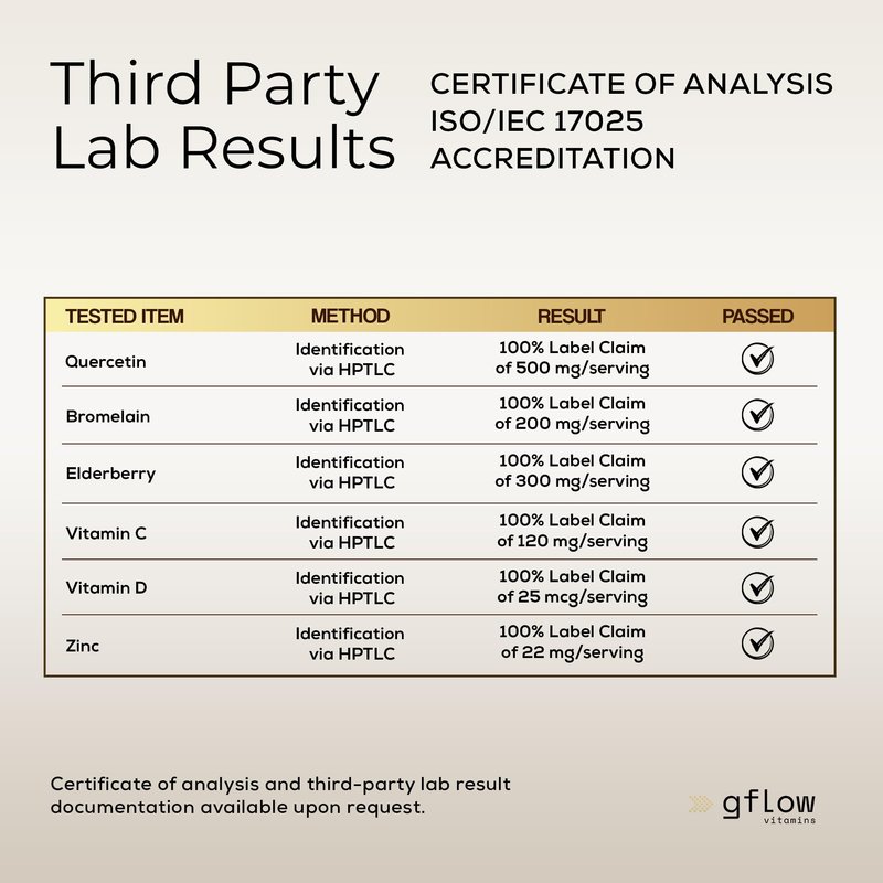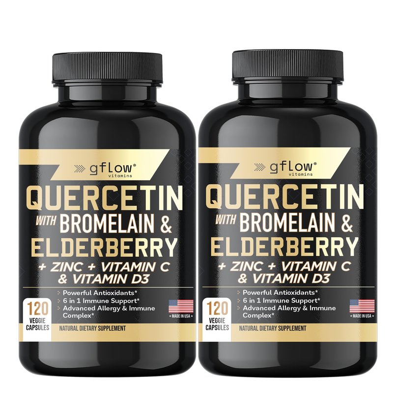 Gflow Vitamin's easy-to-swallow capsule is packed with a powerful 500 mg of Quercetin, 200 mg of Bromelain, and 120 mg of vitamin C to increase the absorption of quercetin. With 300 mg of Sambucus Black Elderberry for extra support. It also contains 22 mg of Zinc and 25 mcg of Vitamin D3 to support and help your body absorb the necessary nutrients. Quercetin + Elderberry, two plant extracts that have been shown to support the immune system response upon exposure to environmental challenges.*