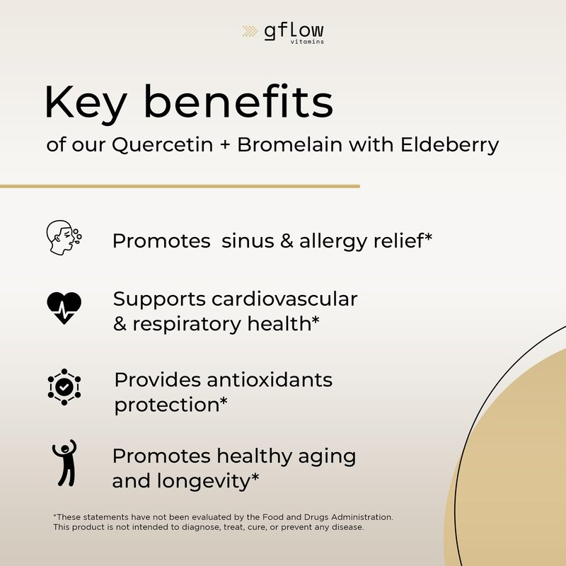 - A POWERFUL COMBINATION TO BOOST THE IMMUNE SYSTEM: Quercetin is a plant pigment naturally found in fruits and vegetables. Gflow Quercetin with Bromelain has also vitamin C, Zinc, and Vitamin D3, and elderberry. Sambucus elderberry works together with the other ingredients to help the body absorb the quercetin more effectively