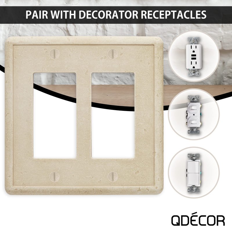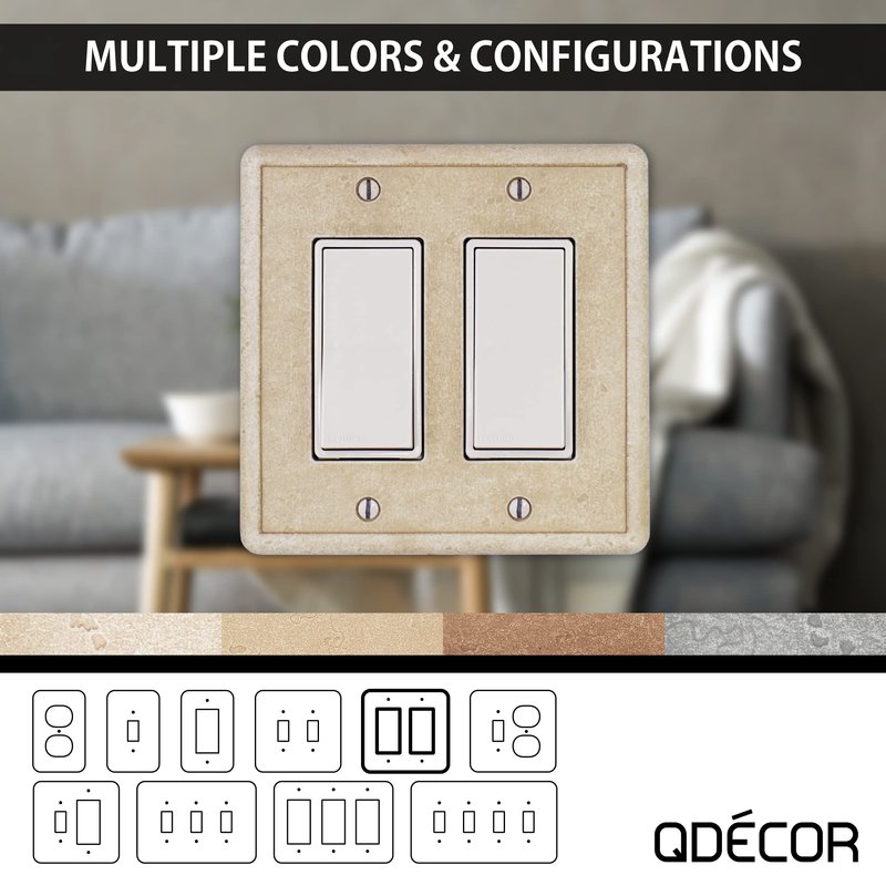QDecor decorative electrical outlet and switch plate covers are made in the USA and hand crafted with unique design features that are perfect for home remodeling and renovations. Updating your existing contractor grade wall plates with our decorative switch plates is an easy way to add a modern finishing detail to your home décor or electrical projects. Our durable finish is available in grey, noche, sand and travertine to accent your natural stone tile and countertops. Questech Decor tumbled texture wall plates are easy to install and great for DIY home projects, these accessory upgrades will add the perfect finishing touch to your home. Package Includes Standard size light switch plate or electrical outlet cover Coordinating mounting screws for a perfect color match Multiple Configurations Available: We offer a variety of electrical face plate configurations including single toggle, single duplex, single decorator GFCI wall plates, as well as double toggle, double decorator GFCI, triple toggle and triple decorator GFCI , quadruple toggle and comination switch options options to coordinate with any electrical outlet, light switch or dimmer application. Can be used for any standard size smart switches and smart outlets with wifi usb ports (please check with smart switch manufacturer for sizing details). Easy Installation: Mounting screws are included. Use a handheld screwdriver and do not over tighten upon installation. Safe for installations in wet areas such as kitchens and bathrooms. Scratch and Stain Resistant: Ideal for any application because our patented Q-Seal technology provides a durable scratch and rust resistant surface that protects against stains. Questech Decor wall plates and outlet covers are durable and easy to clean. Premium Material: QDecor products are made of light weight composite material which combines real premium stone and metals such as nickel silver, bronze and iron with polymers and ceramic for a high quality finish.