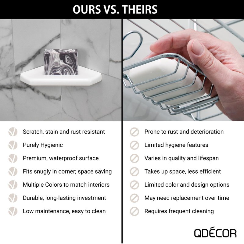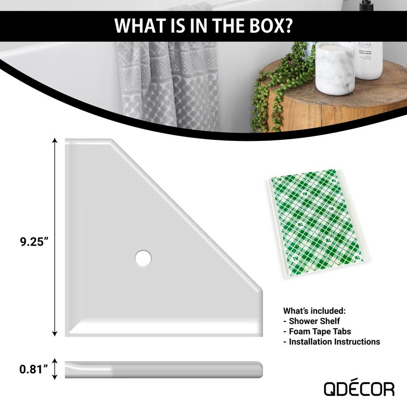 Questech Décor flatback shower shelves are designed to retrofit over existing tile, smooth stone and ceramic wall surfaces (see our use and care guide for complete list of approved surfaces). Our shower caddy shelves are available in multiple sizes including: floating shelves, corner shelves, soap dishes and footrests. Choose from a wide variety of stone and metal finishes to coordinate with any interior design elements. Available polished or matte finishes include graphite black, grey, white, sand, copper, bronze, brushed nickel, wrought iron, gold and oil rubbed bronze. Sample kits are available for purchase so you can choose the perfect finish for your bathroom decor. All QDécor shower shelves are made in the USA. Scratch and Rust Resistant: Q-Seal technology is made for wet areas providing a scratch and rust resistant surface that protects against stains No Drill Installation: Our 1-2-3 step installation makes it easy to install over existing tile and bathroom surfaces without damaging your tile ADHESIVE NOT INCLUDED (SOLD SEPARATELY) Review the full list of recommended adhesives on the instruction sheet. Use the construction adhesive type most suitable for your application: Two-part epoxy gel/paste adhesive: Designed for vertical and overhead surfaces with no-run no-drip formula Polyurethane construction adhesive: 1 part polyurethane formula 3 Step Installation: Use double sided tape provided and place on the 4 specified areas on the back of accessory – remove paper tabs before installation Following the adhesive manufacturer’s instructions, apply epoxy adhesive along guideline on back edges of accessory After epoxy adhesive is applied and the part is positioned, it can be supported for 24 hours until the adhesive sets up sufficiently to form a final bond. Once fully cured, thoroughly caulk around the perimeter of the accessory to seal out water NOT FOR INSTALLATION OVER FIBERGLASS OR SHOWER INSERT SURFACE
