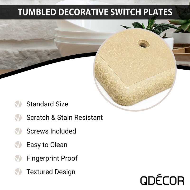 Dive into the modern elegance of home decor with Questech Decor's Tumbled Texture stone collection, embodying the pinnacle of contemporary design with our decorative electrical outlet and switch plate covers. Made in the USA, these pieces are not just accessories but essential elements to enhance the aesthetic appeal of any space. Our selection of outlet covers and light switch plates features a palette of modern finishes, including grey, noche, sand, and travertine, meticulously chosen to complement your sophisticated home environment. They are the perfect match for natural stone tiles and countertops, adding a refined touch to your interior design scheme. Designed with the modern homeowner in mind, these wall plates offer effortless installation, making them ideal for both renovation projects and DIY enhancements. With configurations ranging from single toggle and duplex to decorator GFCI and smart outlet-compatible designs, our collection meets a wide array of electrical requirements, ensuring compatibility with contemporary smart home devices. Incorporating cutting-edge Q-Seal technology, our switch plates are engineered for durability, boasting a surface that resists scratches and stains. This innovation ensures longevity and ease of maintenance, particularly in high-traffic areas like kitchens and bathrooms. The lightweight composite material blends high-quality stone and metal with advanced polymers and ceramics, setting a new standard for design and functionality in home decor. Elevate your living space with Questech Decor's selection of outlet covers and electrical wall plates, where modern functionality meets design excellence, offering a sophisticated finishing touch to your home's interior.