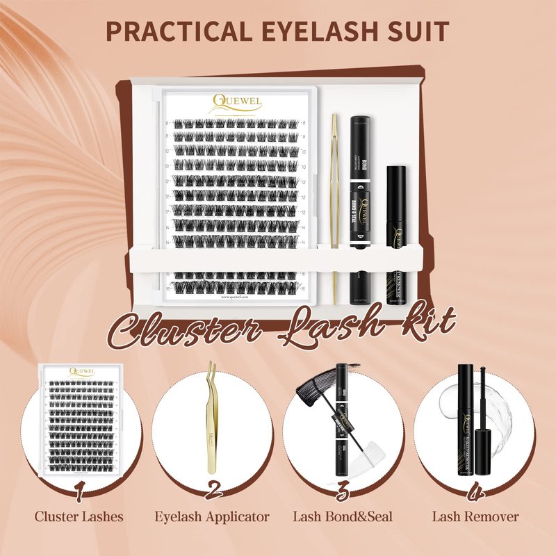 - 🌺【DIY Lash Extension Kits】QUEWEL DIY eyelash extensions kits, 144pcs wide stem lash clusters, black lash bond&seal, a golden tweezer for applying lash clusters and 5ml cluster eyelashes glue remover, you can get all the products you need for DIY eyelash extensions at an affordable price, so convenient to use at home or travel, without taking up too much storage space.
