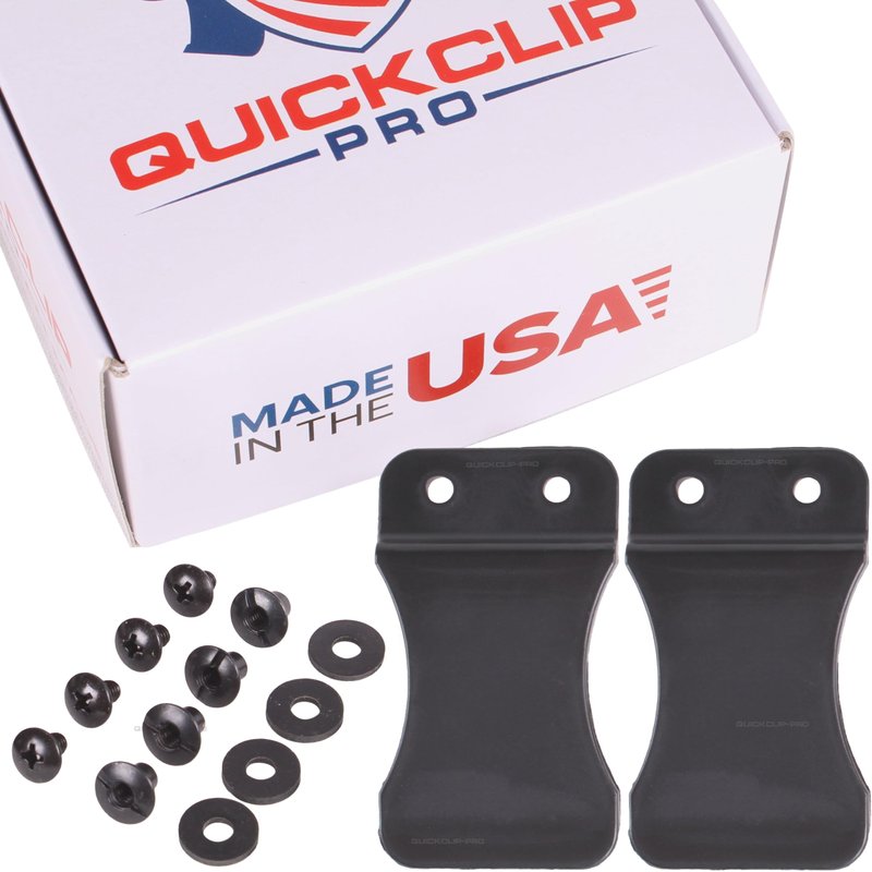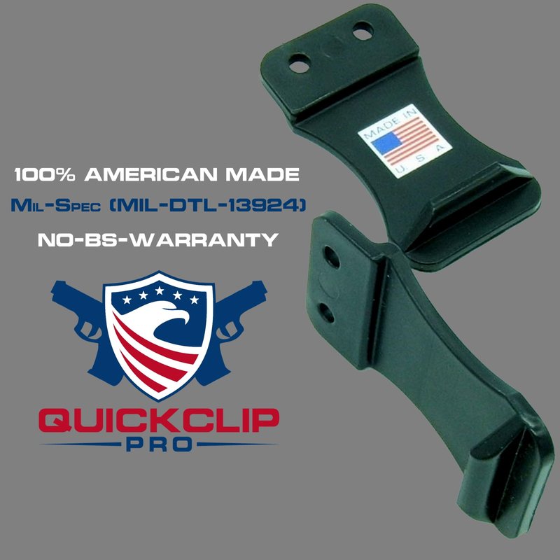 Quick Clip Pro Quick Clips give you the functionality of handmade Kydex Clips with the strength of a polymer clip. Non-Branded Design allows the custom holster maker to let his handcraft standout above everything elseOur extra thick polymer material means more durability and a longer lifespan as well as less time hand making clips! All clips come with pre-drilled holes that are .75" apart on center, we include mounting hardware but they may need to be drilled out larger depending on the materials you are using for your holster . All of our clips are Made in USA, they include a Lifetime -No-B.S. Warranty...so take your holster to the next level with Quick Clips Pro!