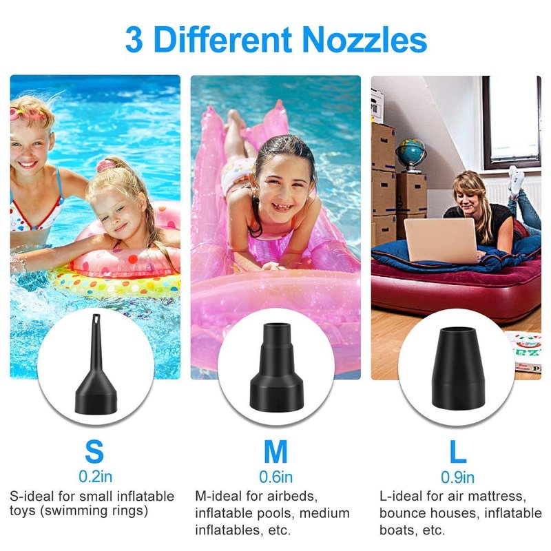 - ●3 NOZZLES OPTIONAL● Quick air inflator, has 3 nozzles optional, can fit most floaties you need to inflate or deflate, such as airbed, inflatable sofa, air-filled toys, inflatable pool, and swimming rings etc.