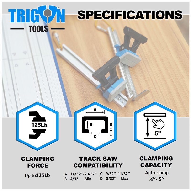 - Tracksaw guide clamps- Clamping capacity up to 5'' thickness, clamping pressure 125Lb, slides into track saw guide or any track of plunge saw or tracksaw extension. A must have track saw accessories or circular saw accessories