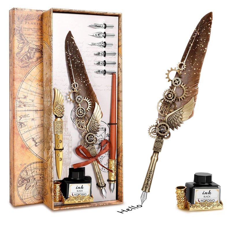 Quill Pen Calligraphy Pen Set - Antique Mechanical Steampunk Style -Mechanical Design Feather Pen with Wooden Dip Pen for Fun Writing Experience. Quill Pen Ink Set is a Basic Calligraphy Kit.(Grey)