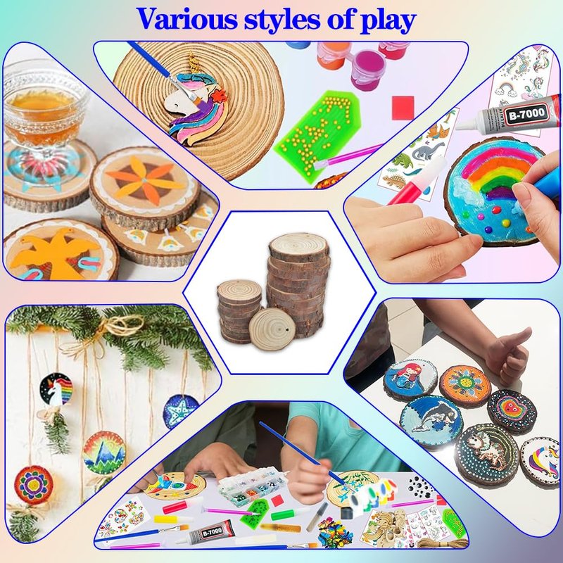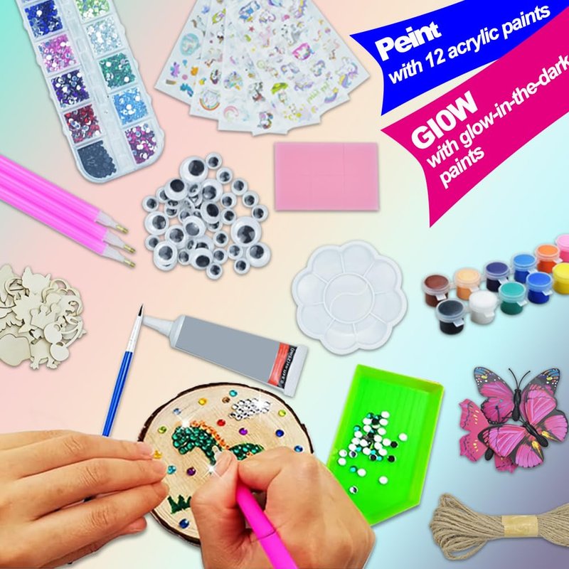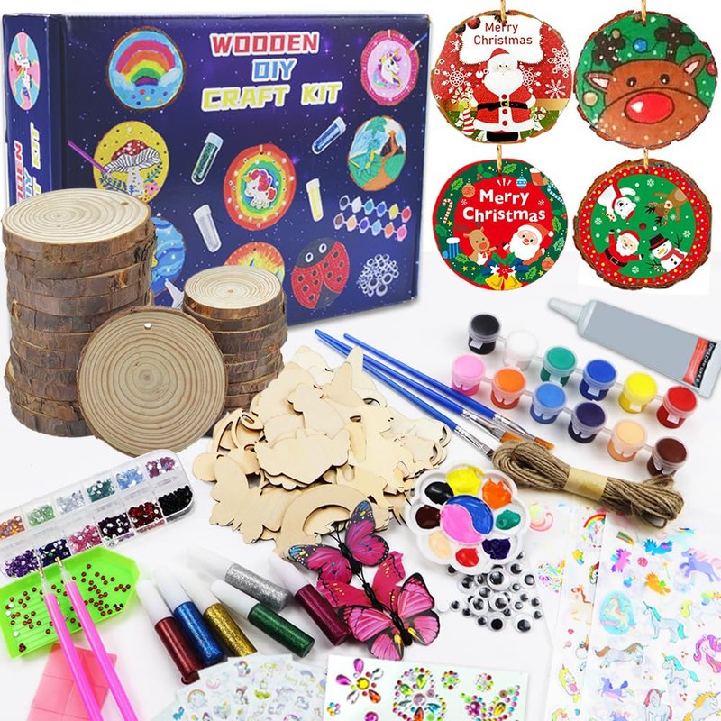 - Fun Adults Arts and Crafts Set:This arts & crafts kit has everything you need to create art, including wood slices, wooden ornaments, plus glow-in-the-dark paint, stickers, string and other essentials. This hands-on experience encourages self-expression through unique wooden projects for Kids Adults.