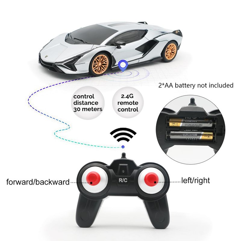 - 【2.4G REMOTE CONTROL CAR】The car built in 2.4G frequency. Two or more cars can run in the same time! Requires 3 * AA Batteries for the car and 2 * AA Batteries for the remote controller (NOT INCLUDED); Package includes 1 * 1/24 remote control car,1 * dual-grip remote-controller.