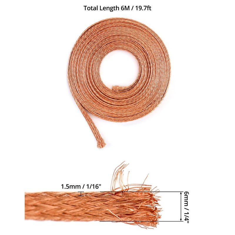 QWORK Flat Copper Braid Cable, 20ft 6mm Flat Copper Braided Ground Strap Wire, Flexible Shielding Wire Mesh, 1 Pack