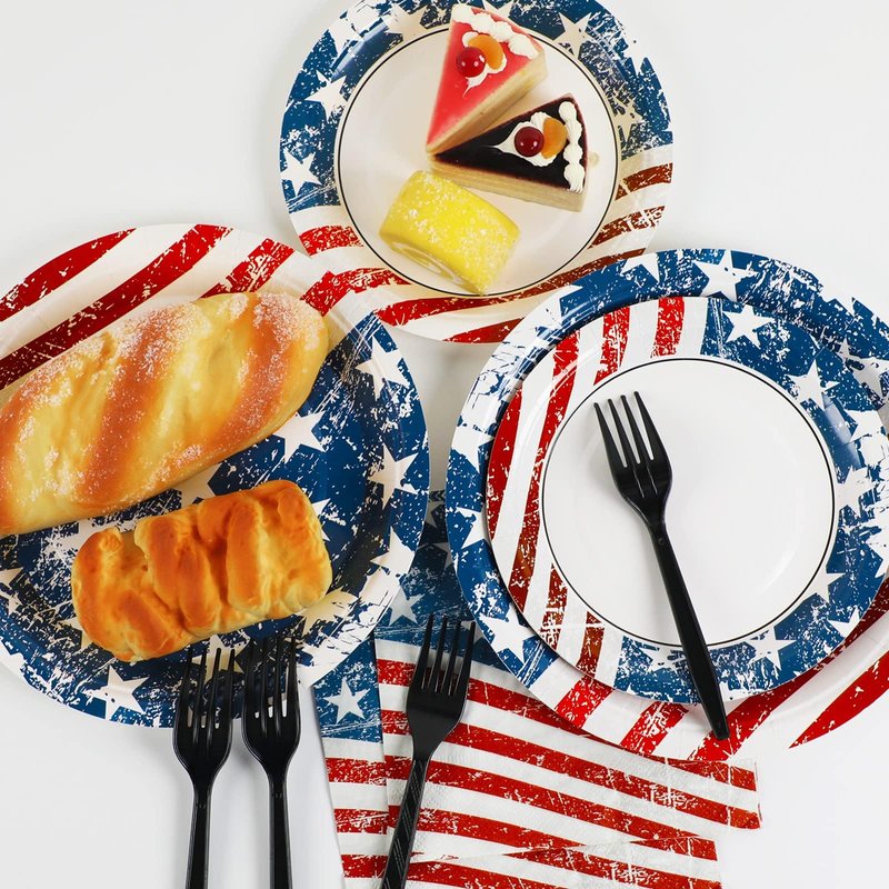 - 【4th of July Party Tableware Set】100 pieces patriotic party dinnerware set, including 50 paper plates of two sizes, 25 American Flag birthday napkins, and 25 forks. This set includes everything you need for up to 25 guests, making it the perfect choice for your 4th of July birthday party.